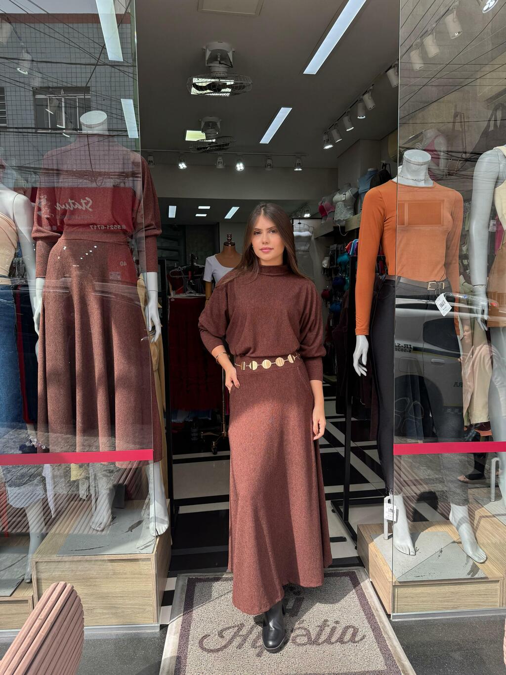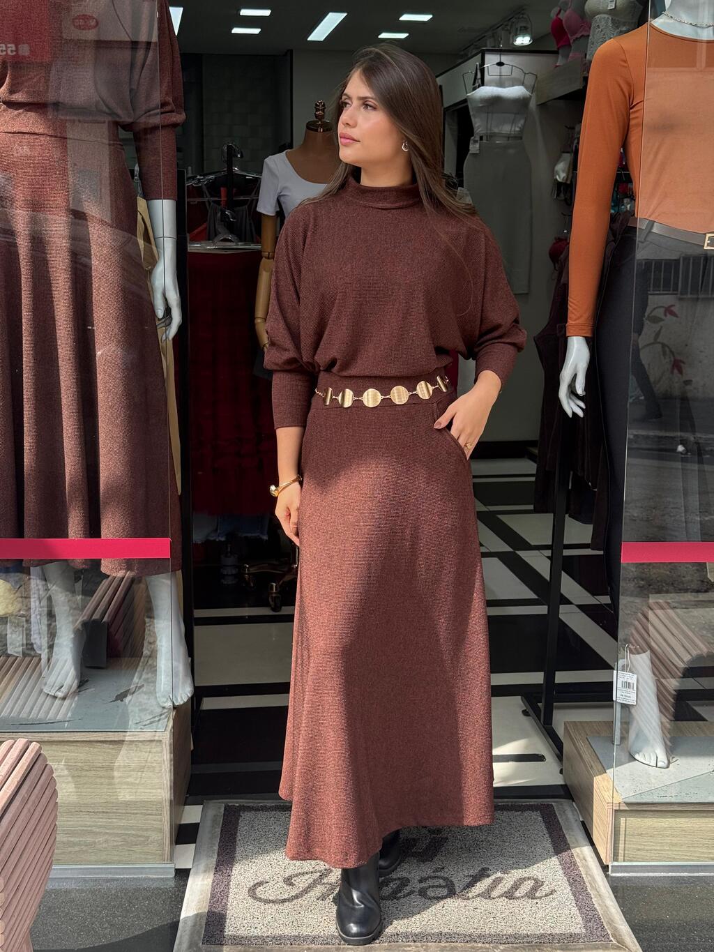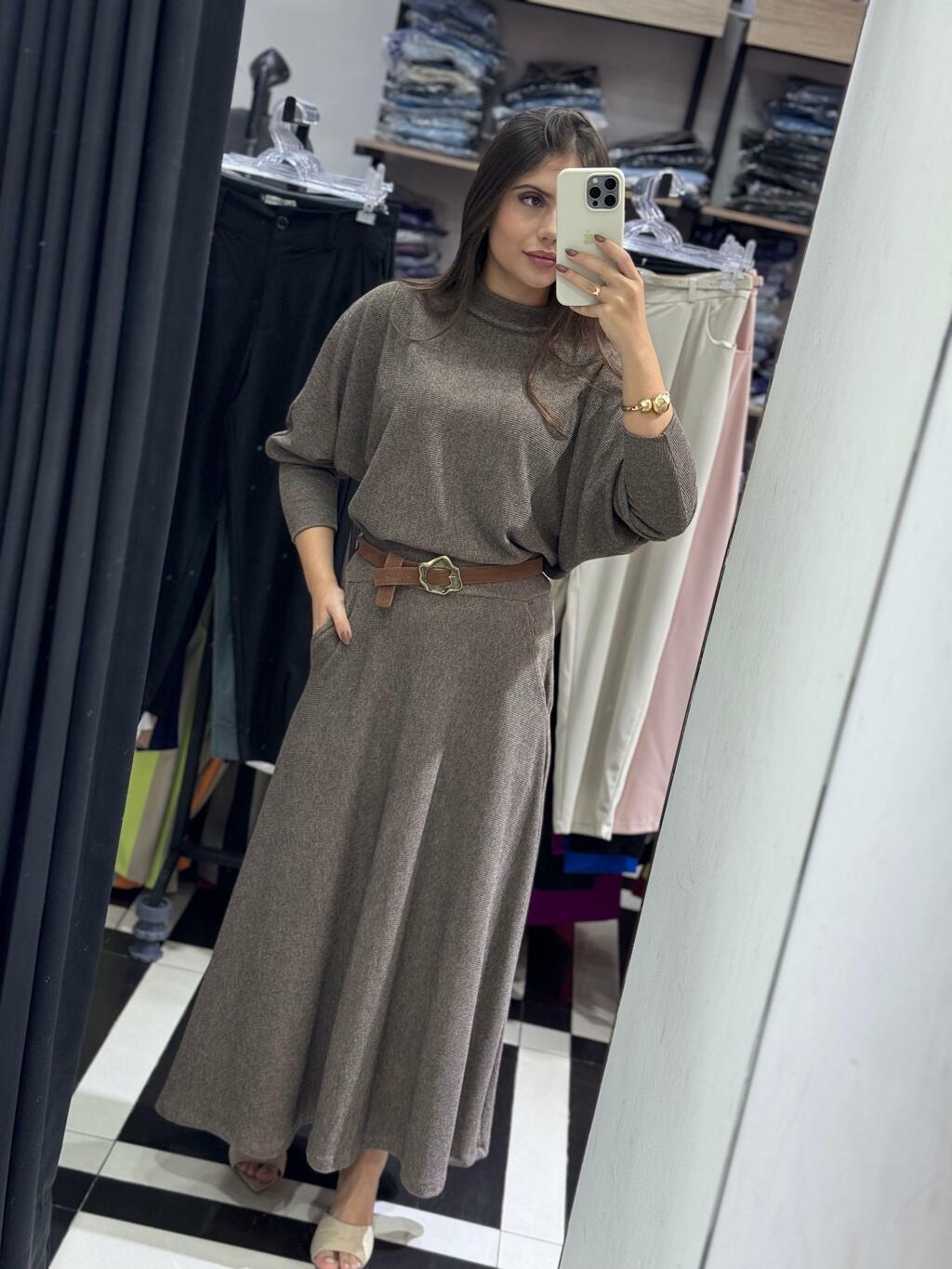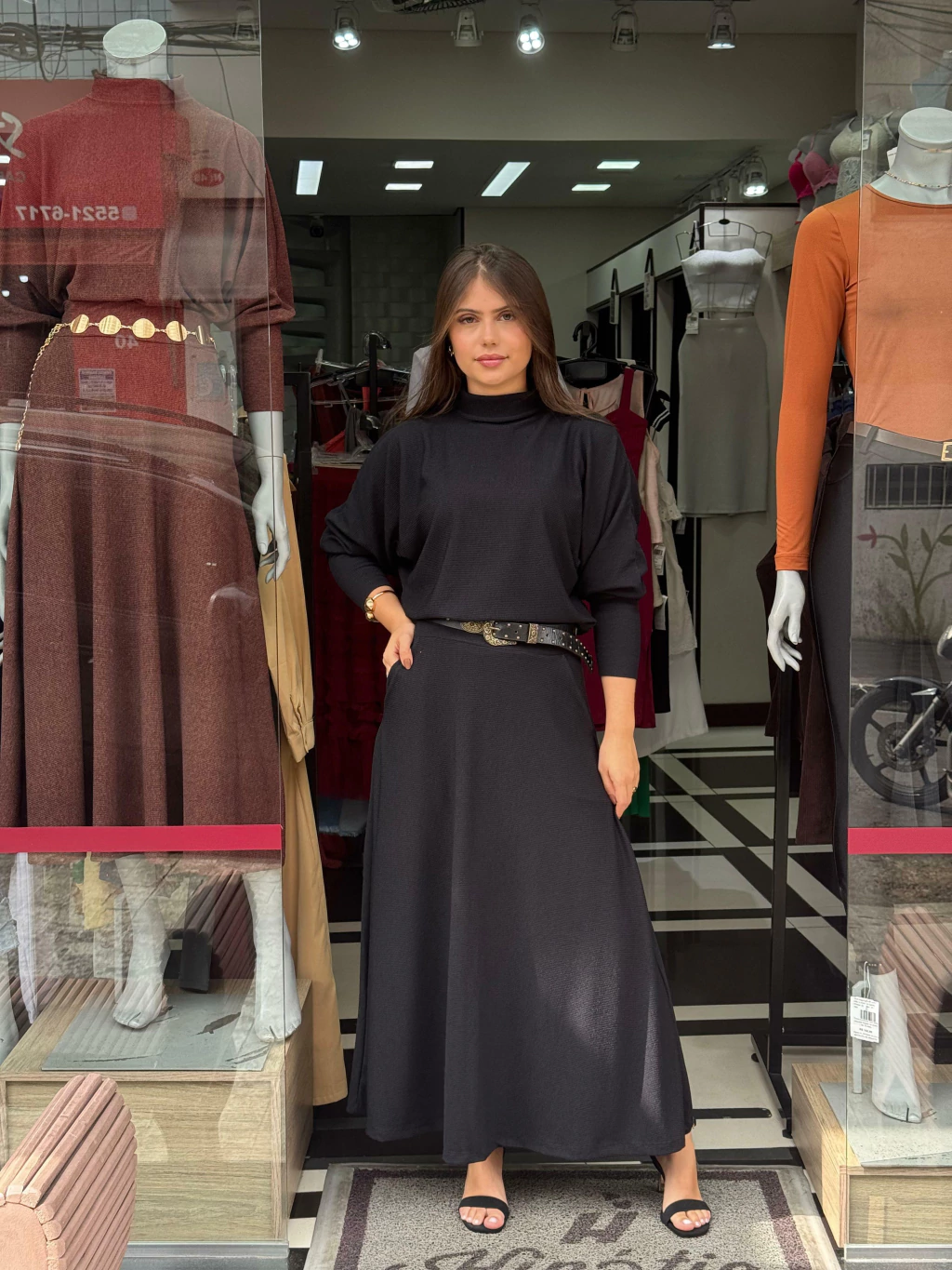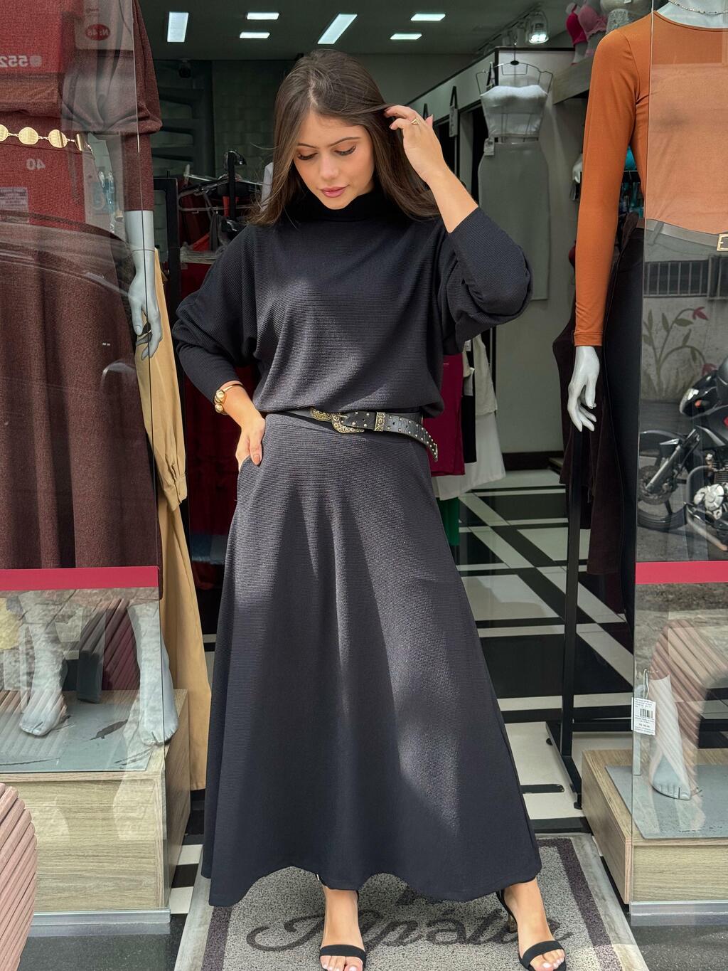 Conjunto de Saia midi com modelagem Evasê e Blusa ampla no modelo "morcego"