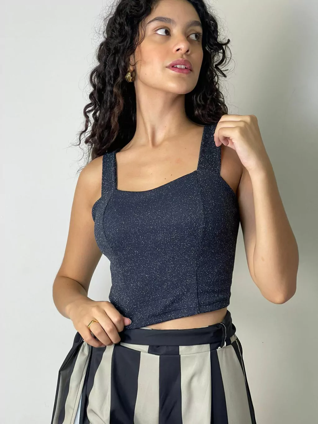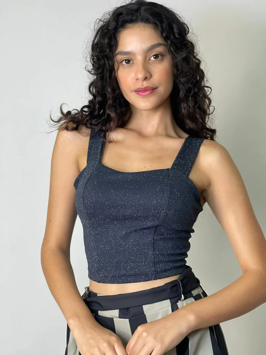 Tecido em lurex possui fios de brilho em prata por toda a peça