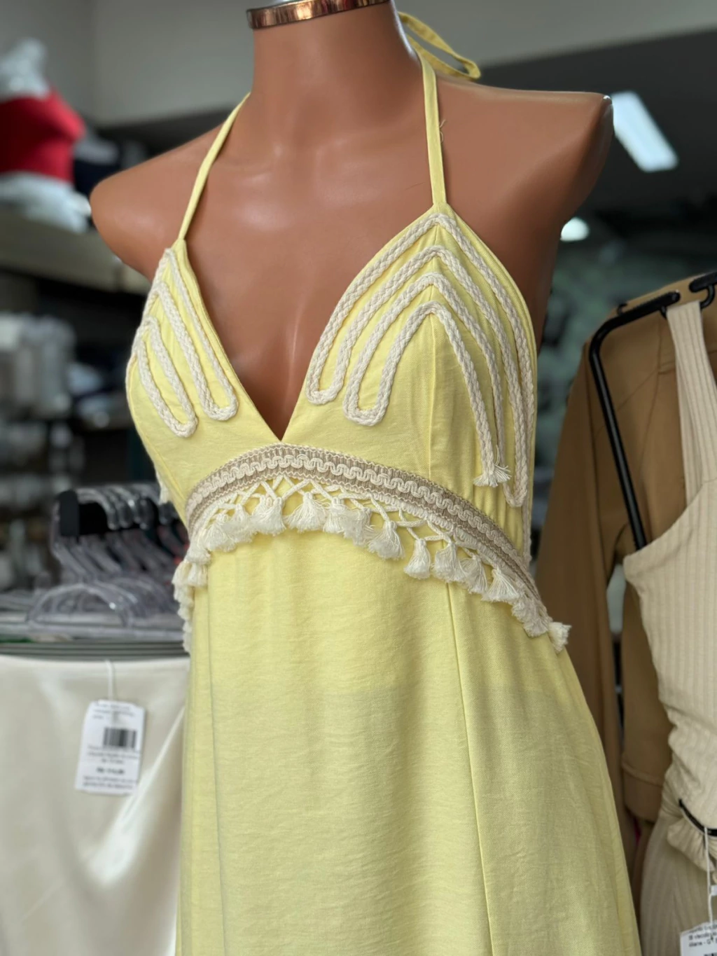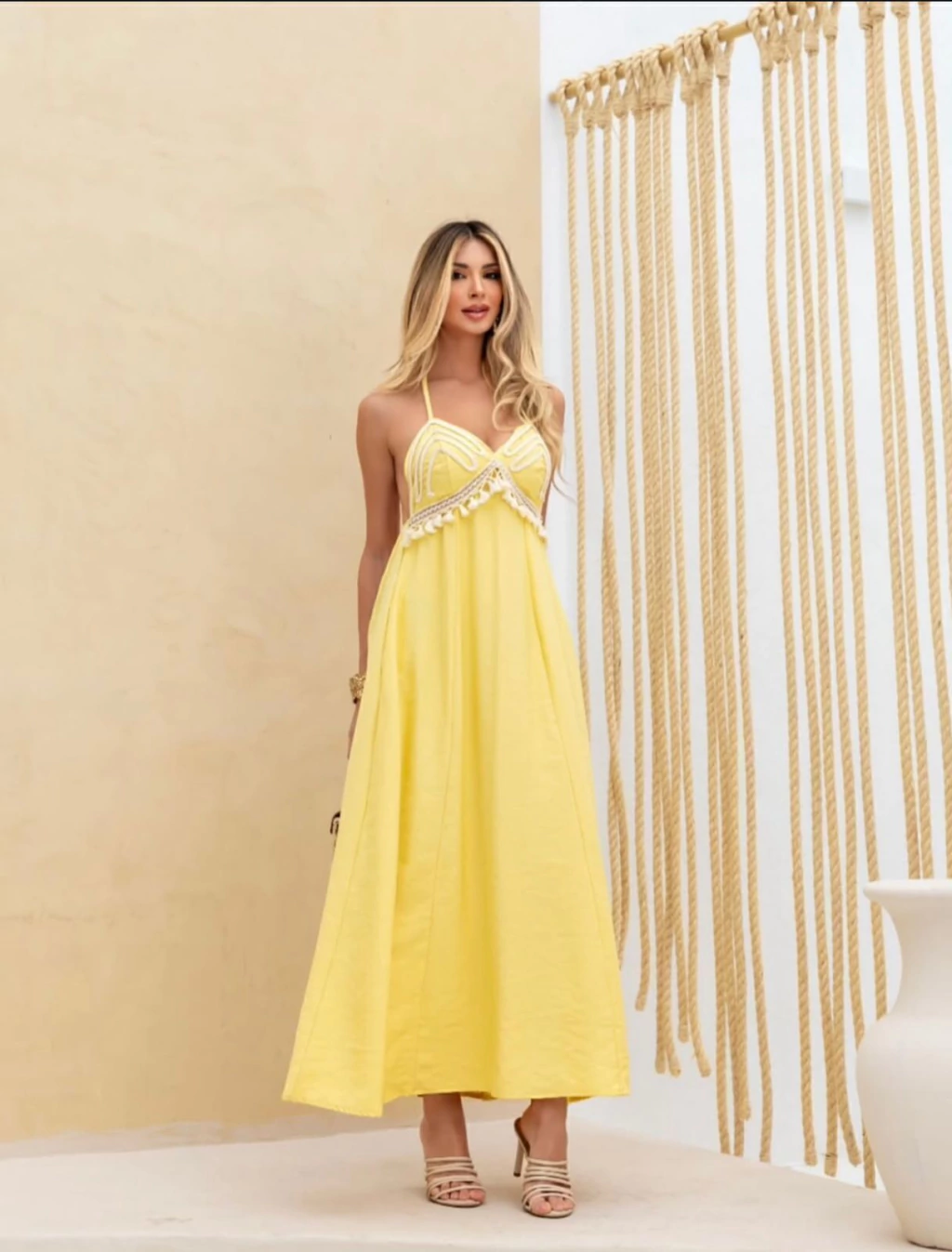 Vestido estilo longuete com detalhes em crochê no busto